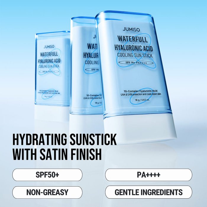 ضد آفتاب استیکی واترفول جومیسو spf50( بمب ابرسانی)Jumiso Waterfull Hyaluronic Acid Cooling Sun Stick یکی از محبوبترین محصولات مراقبت پوستی برند جومیسو است که با ترکیب هیالورونیک اسید و فرمول خنککننده، تجربهای سبک، بدون چربی و آبرسان را برای پوست فراهم میکند. این استیک طراحی شده تا بدون نیاز به تماس دست، بهراحتی روی پوست کشیده شود و احساس خنکی فوری و محافظت بالا در برابر آفتاب ایجاد کند.