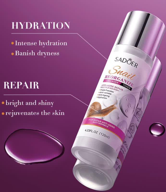 تونر آبرسان حلزون سادور (SADOER Snail Reorganize Collagen Toner) یک تونر تخصصی برای آبرسانی، جوانسازی و تغذیه پوست است. این تونر با ترکیب منحصربهفرد عصاره حلزون و کلاژن، به بازسازی بافتهای پوستی کمک کرده و از پیری زودرس جلوگیری میکند.